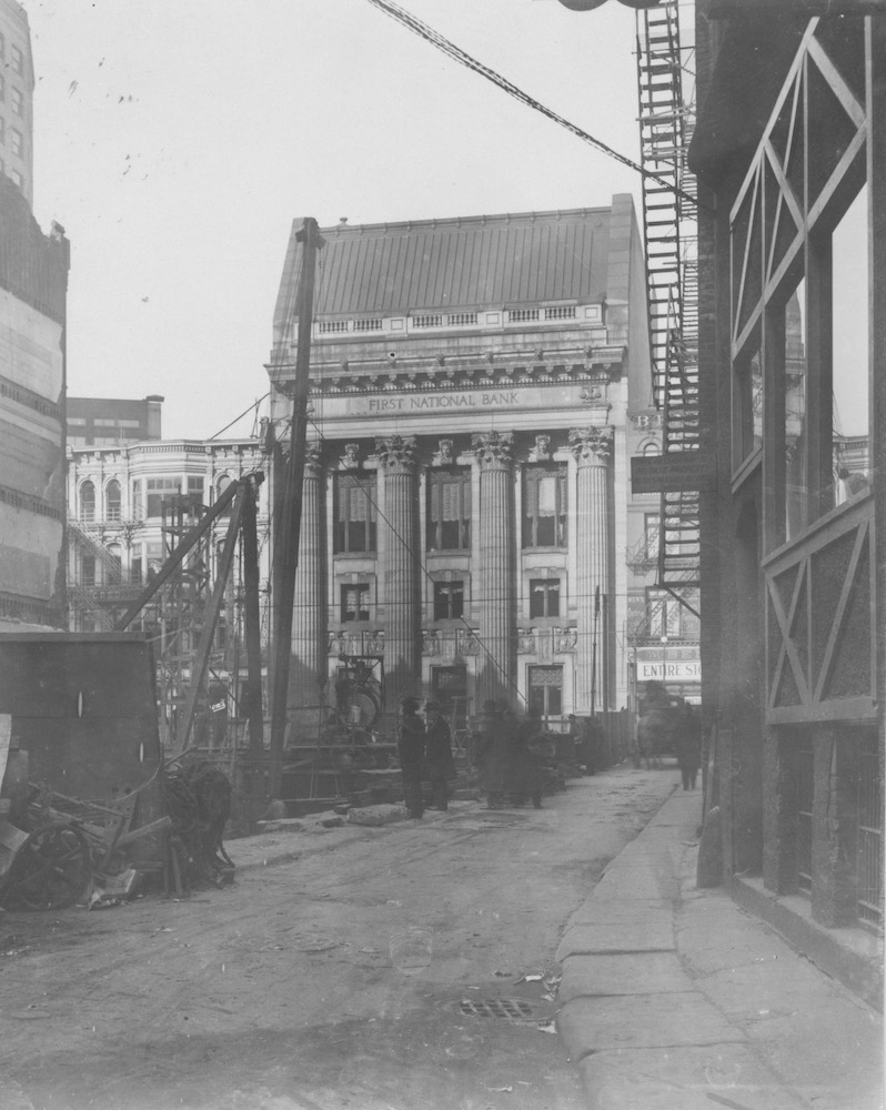 Following Cleveland's comprehensive change of city street names in 1905, Hickox Alley became East 3rd Street. This photograph of East 3rd Street facing north toward Euclid Avenue was taken in 1914. The construction work on the left is for the new W. T. Grant Building. To the right is a partial view of the Hermit Club which was built on (then) Hickox Alley in 1904. The Club moved to a new building on Dodge Court in 1928. | Source: Cleveland Public Library, Digital Photograph CollectionDownload Original File