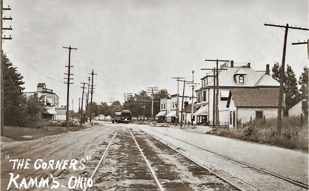 Postcard Marked "The Corners" ID: 10679 | This file appears in: Kamm Building Kamm’s post office/grocery store can be seen on the right, and the Cleveland and Southwestern interurban railway tracks on Lorain Street (now Avenue). | Creator: Lina Zinn | Date: 1911 | Source: westparkhistory.com Download Original File CreatorLina ZinnSourcewestparkhistory.comDate1911 "Postcard Marked "The Corners"" appears in: Kamm Building