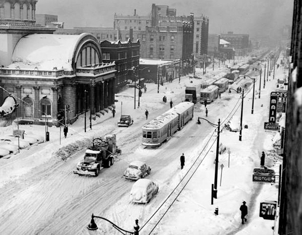 Automobiles, streetcars and snowplows ply a slippery Euclid Avenue just west of the Cleveland Clinic. | Source: Cleveland Memory Project, Cleveland State University Library Special CollectionsDownload Original File
