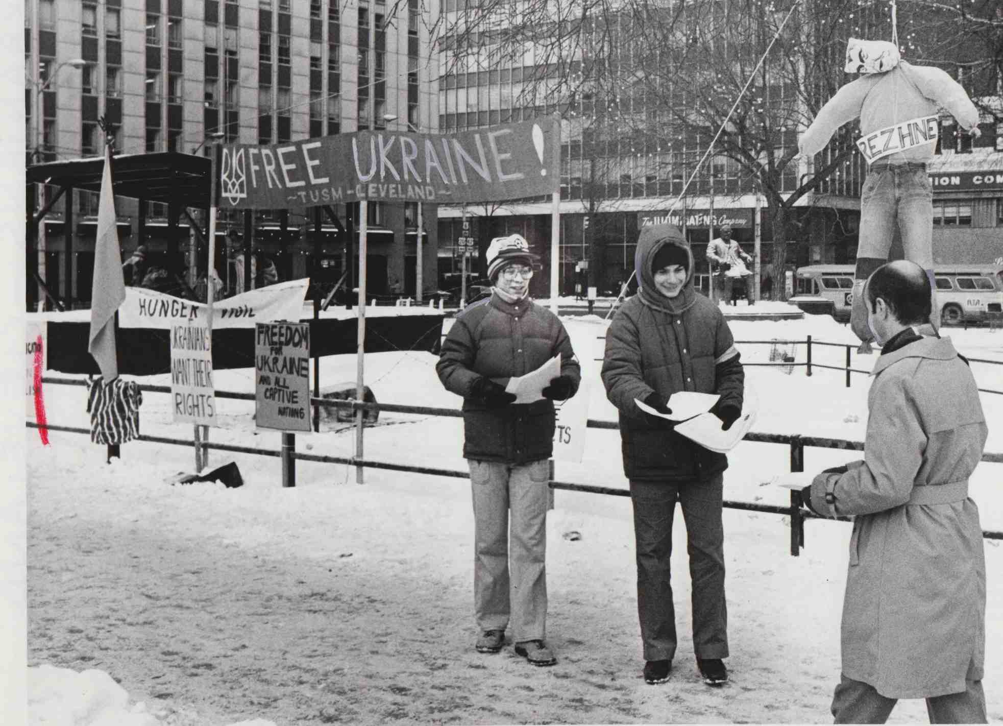 Young men from the Ukrainian community hand out flyers in Downtown Cleveland in 1981, raising awareness of Ukrainian demands for independence from the Soviet Union. A number of Ukrainians who fled from Communism after World War II found refuge in Cleveland and became vocal opponents of the USSR's presence in their homeland. | Date: 1981 | Source: Cleveland Memory Project, Cleveland State University Library Special CollectionsDownload Original File