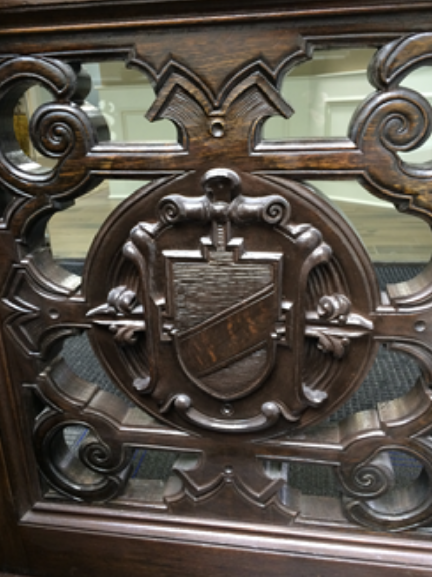 Gracing the Atrium ID: 10706 | This file appears in: Weber's Restaurant The Schlather family crest, reinstalled at the (now closed) Atrium Restaurant, was carved into the Casino/Weber's staircase immediately adjacent to the bar. | Creator: Betty Lou Higgins, 5.4.18 Download Original File CreatorBetty Lou Higgins, 5.4.18 "Gracing the Atrium" appears in: Weber's Restaurant