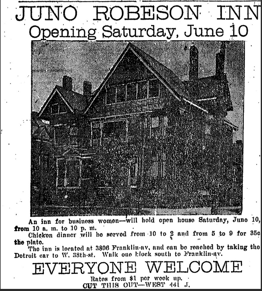In 1911, Juno Robeson, a social worker who had moved to Cleveland from Paducah, Kentucky, opened her Inn for Business Women in the Sarah Bousfield House. Having purchased the property in the summer of 1910, Robeson may have made alterations to the interior of the house in 1910-1911 to allow access between the two sides of the former two-family house. In any event, according to Cleveland directories and newspaper advertisements, the house appears to have had a single address and was no longer treated as a two-family house by 1915. | Source: Cleveland Public Library, Digital Newspaper CollectionDownload Original File
