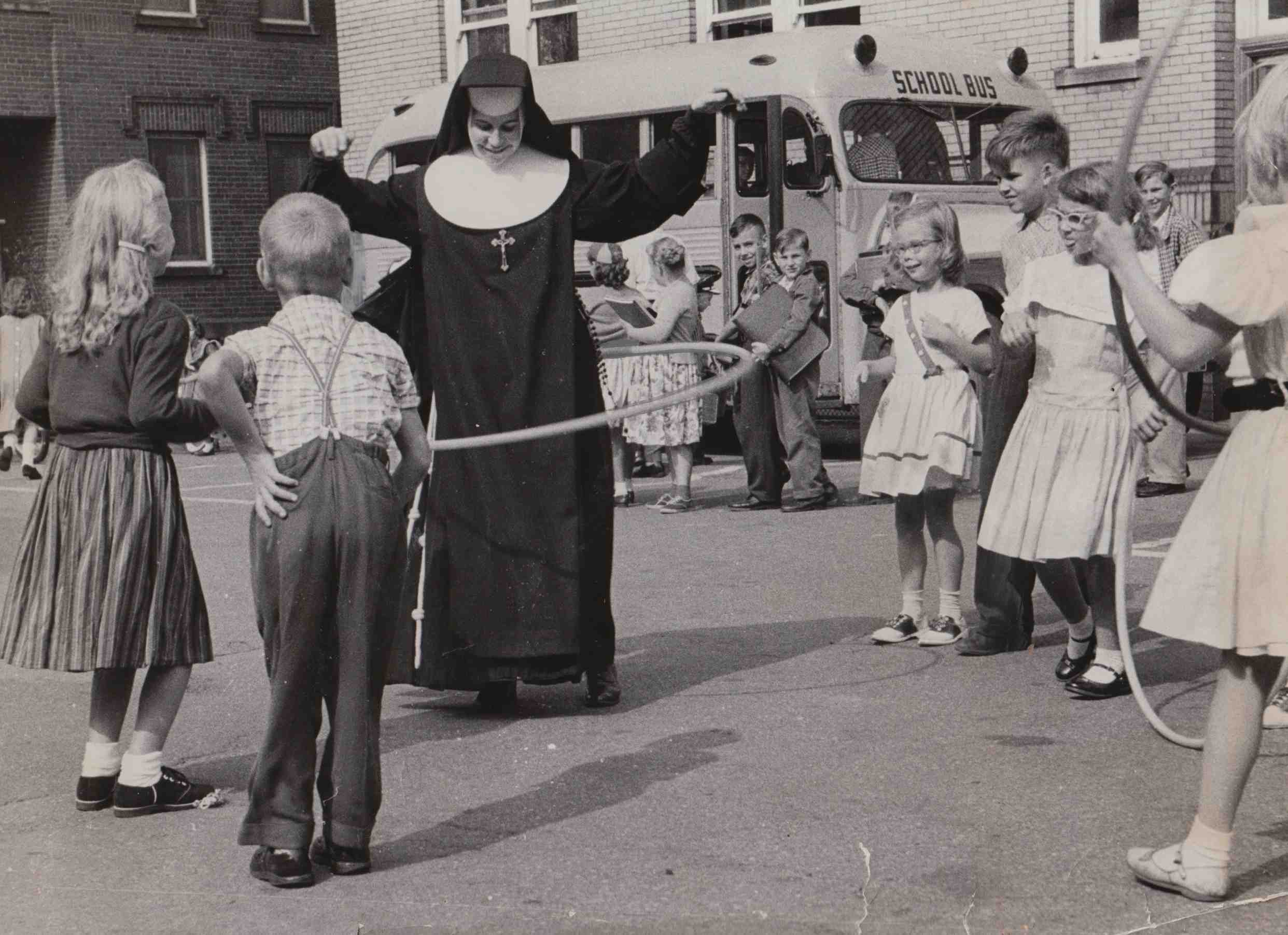 St. John Cantius School, 1958 ID: 1073 | This file appears in: Saint John Cantius Catholic Church Sister Mary Corrine, a second grade teacher at St. John Cantius School, hula hoops. Image courtesy of Cleveland State Library Special Collections Download Original File "St. John Cantius School, 1958" appears in: Saint John Cantius Catholic Church