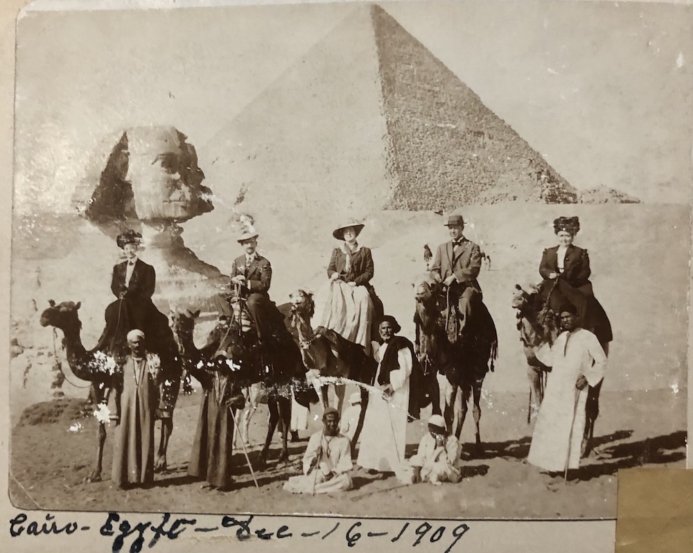 Cleveland newspapers noted several trips that John and Sarah Bousfield, both immigrants from England, made back to Europe during their marriage. On at least one of those trips, they were accompanied by their daughter Charlotte. After selling her parents' house in 1909, Charlotte and her sister Emma went on a trip that took them around the world. In this photograph taken on December 16, 1909, they are visiting a pyramid in Egypt. Sitting on camels, Charlotte is the first woman on the left; Emma the second. | Source: Patrick Wilhelm, a third great-grandson of John and Sarah BousfieldDownload Original File