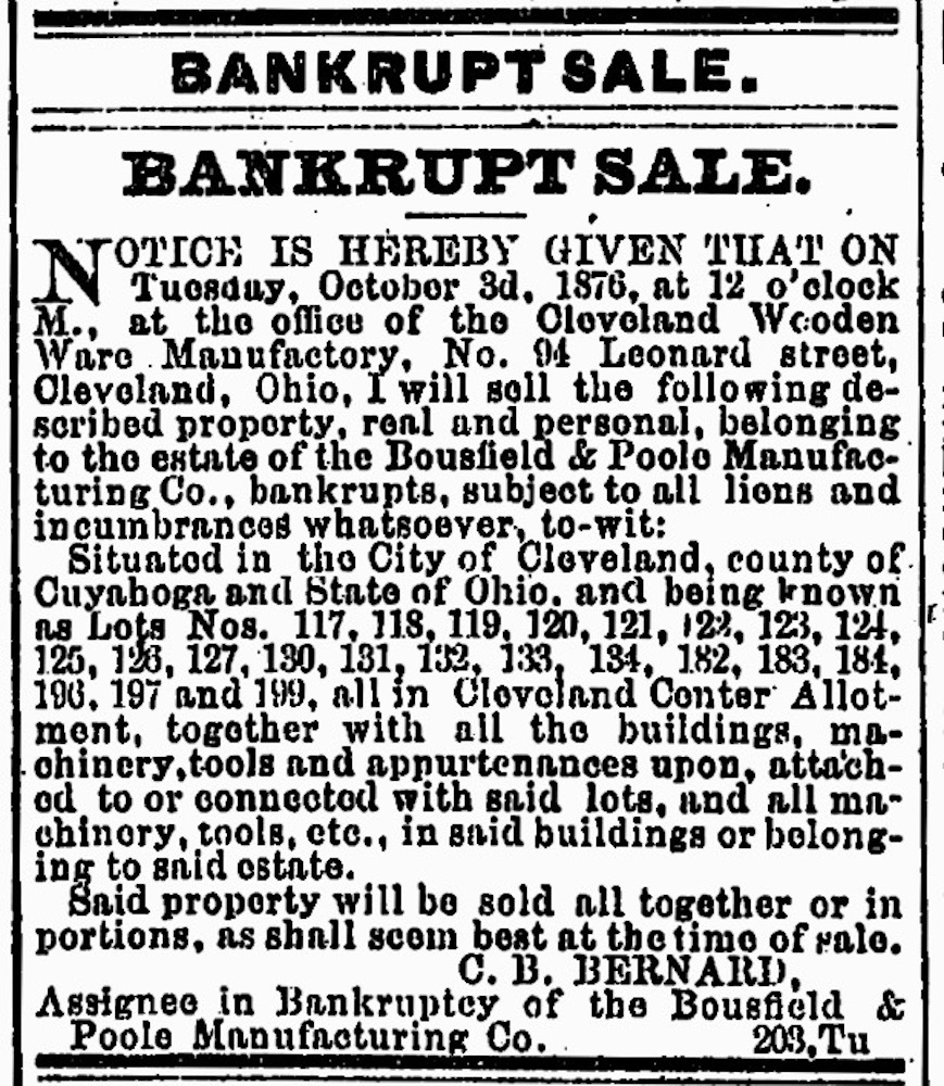 This ad for a bankruptcy sale appeared in the Cleveland Leader on September 19, 1876. Offered for sale were all of the real and personal property assets of Bousfield & Poole, the partnership which operated the Cleveland Wooden Ware Manufactory at 94 Leonard Street, in Cleveland Centre. | Source: Cleveland Public Library, Digital Newspaper CollectionDownload Original File