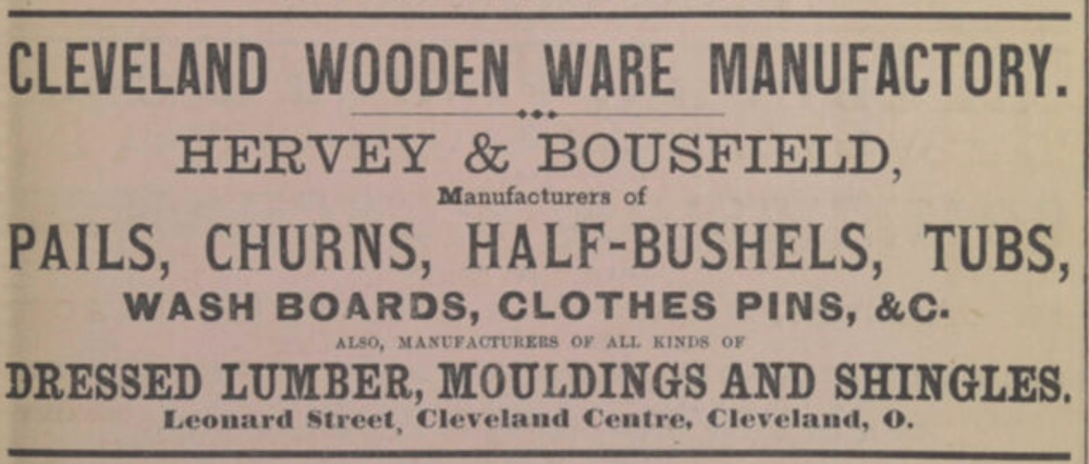 Hervey & Bousfield Ad ID: 10737 | This file appears in: Sarah Bousfield House This ad for the wooden ware business of J.B. Hervey and John Bousfield, which was operated out of Cleveland Centre, appeared in a Cleveland directory in 1860. | Source: Cleveland Public Library, Directory Collection Download Original File SourceCleveland Public Library, Directory Collection "Hervey & Bousfield Ad" appears in: Sarah Bousfield House