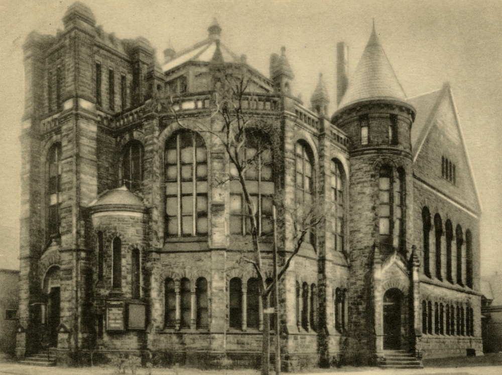 Designed by the architectural firm of Coburn and Barnum in 1883, this great stone church was erected on the southeast corner of Franklin Boulevard and Taylor (West 45th) Street during the years 1883-1885. Robert Wallace, who was a member of the parish and a trustee of the church, was deeply involved in the planning and siting of the new church, which, when completed, was just several blocks down the street from Wallace Manor. The First Congregational Church was demolished in 1959 and replaced by a new structure built and occupied by the St. Paul Community Church. This undated photo was taken, according to the Cleveland Memory Project, between 1900 and 1929. | Source: Cleveland Public Library, Photograph CollectionDownload Original File