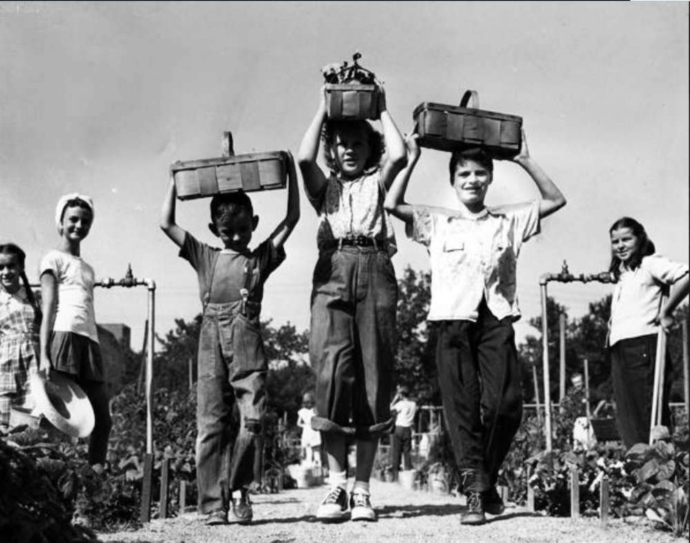Cleveland Kentucky School students (left to right) Frankie Steeber, 6 (1786 Randall Road), Verna Womack, 12 (3702 Woodbine Avenue), and Mike Grealis, 10 (4305 Whitman Avenue), are bringing in their harvest from the Kentucky School Gardens. The gardens were built on the northern grounds of Fairview Park in the 1930s as part of a Cleveland public schools agriculture program. This photo taken in August 1946. | Source: Cleveland State University, Michael Schwartz Library, Special CollectionsDownload Original File