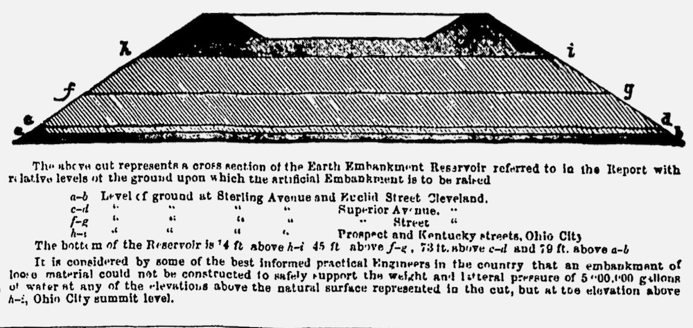 This sketch prepared by Theodore Scowden in a water works report to City Council appeared in the Cleveland Leader on October 10, 1853. It shows the amount of fill that would be required to build an earthen reservoir at various proposed sites in the City. The Franklin Avenue/Kentucky Street site in Ohio City--that city would not merge with Cleveland until 1854--was considered the safest and most economical of the various sites because, in light of its higher elevation above lake level, it would require the least amount of fill in constructing the reservoir's earthen embankment. | Source: Cleveland Public Library, Newspaper CollectionDownload Original File