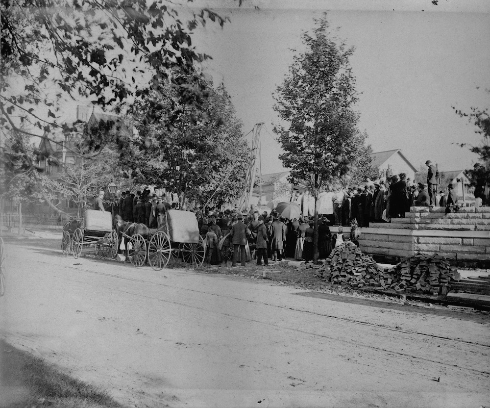 This historic photograph shows parishioners gathered at the southwest corner of Franklin Avenue (Boulevard) and Liberty (West 48th) Street to witness the laying of the cornerstone for the new St. Mark's Episcopal Church constructed between 1890 and 1892. The ceremony was held during the afternoon of September 29, 1890. | Source: Archives of the Episcopal Diocese of OhioDownload Original File