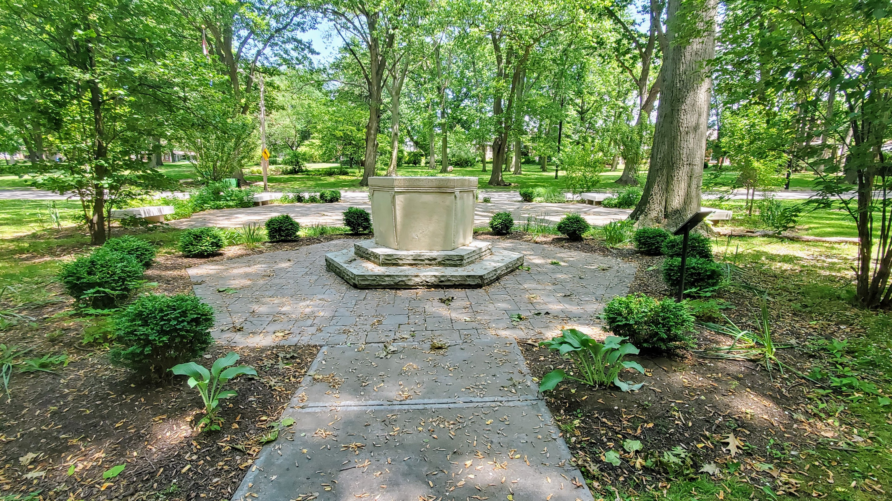 This is the walkway up to the baptismal font. Croatian Cultural Garden visitors can easily walk around and view all six sides of the baptismal font. | Creator: CSU Center for Public History + Digital HumanitiesDownload Original File