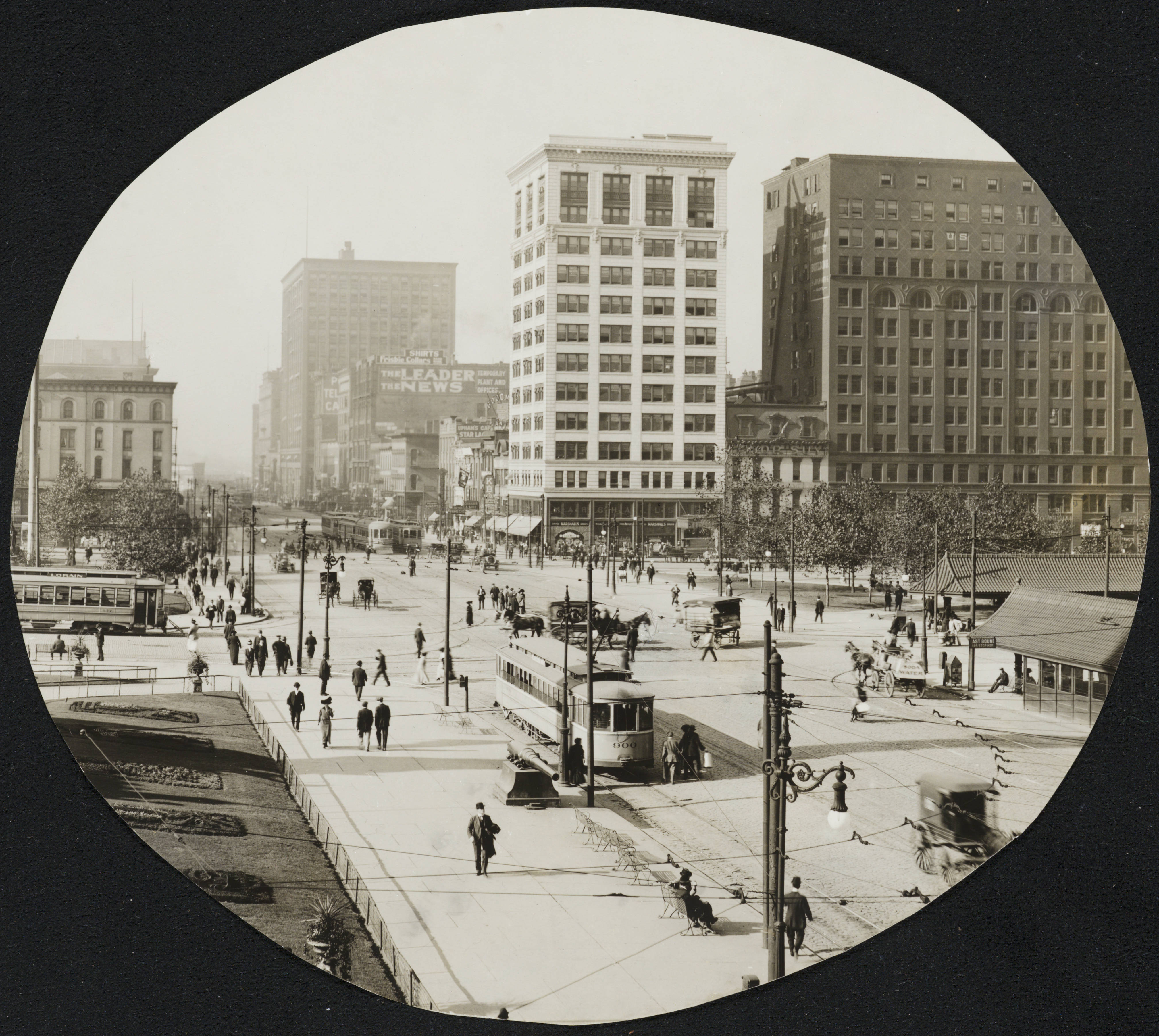 Looking West Across Public Square ID: 10868 | This file appears in: The Rouse Block, Public Square The Marshall Builkding and The American Trust Building are separated by the four story Dime Savings Bank building in this 1916 photograph of the Rouse Block | Date: 1916 | Source: Cleveland Public Library, Photograph Collection Download Original File SourceCleveland Public Library, Photograph CollectionDate1916 "Looking West Across Public Square" appears in: The Rouse Block, Public Square