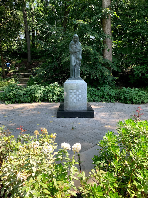 This is an image of the immigrant mother statue. This image shows the immigrant mother statue flanked on both sides by benches made of Croatian Brac stone. The licitar heart-shaped lower plaza is also evident in this image. | Creator: CSU Center for Public History + Digital HumanitiesDownload Original File