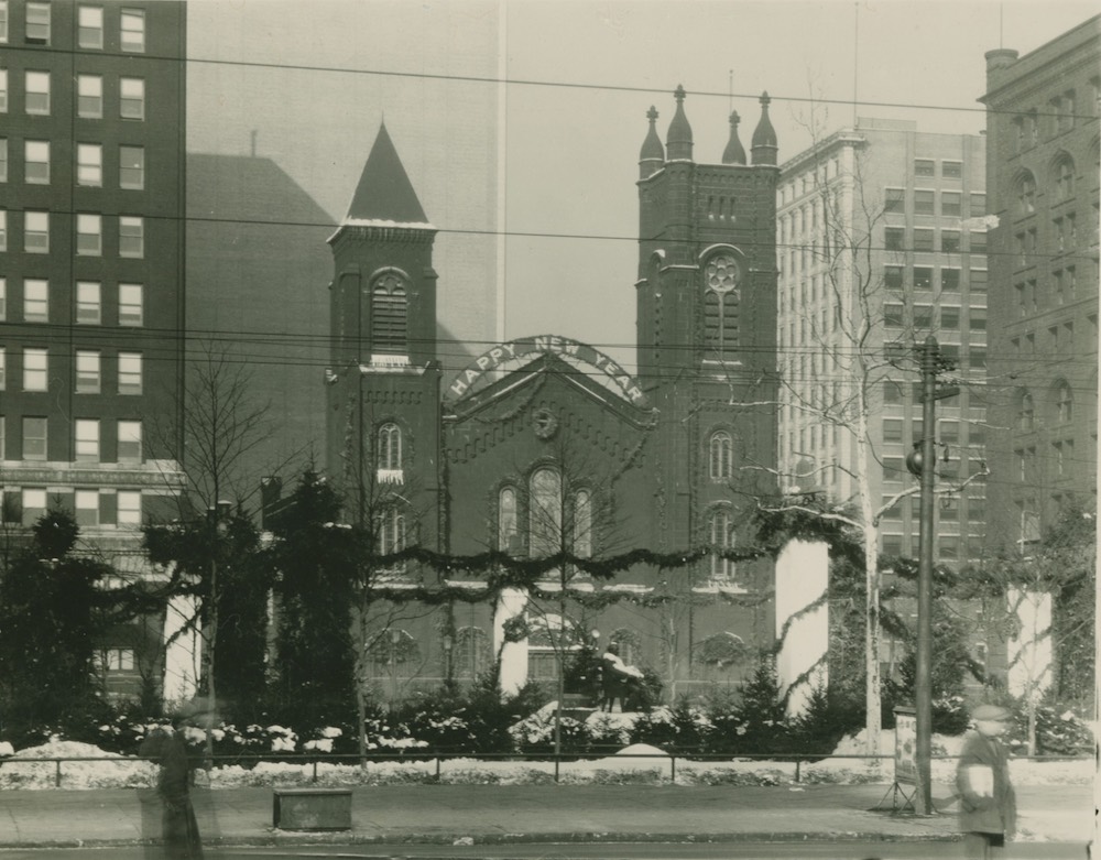 Dedicated on August 12, 1855, the present Old Stone Church structure was built in response to the congregation's growth, as well as their desire for a more modern and elegant edifice. Headed by the architectural firm of Heard and Porter, designs for the church incorporated Romanesque Revival elements. Popular in the United States during the second half of the nineteenth century, the style is characterized in part by steeples of unequal height and semi-circular arches above windows and door opening. Constructed of Berea sandstone, materials for the church walls were primarily quarried in Carlisle Township. At a final cost of $60,000, Old Stone Church was the most expensive, imposing, and beautiful structure on the Public Square at the time of its completion. | Date: ca. 1925-28 | Source: Cleveland Parks Department Photograph Albums, Volume 3 , Cleveland Public LibraryDownload Original File