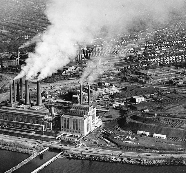 A southward view over the "Forest City" depicts the blend of smokestack power serving a tree-laden city. The power plant provided regional electricity and downtown steam heat to Cleveland. | Creator: Byron Filkins | Date: October 7, 1949 | Source: Cleveland Memory, Michael Schwartz Library Special Collections at Cleveland State UniversityDownload Original File