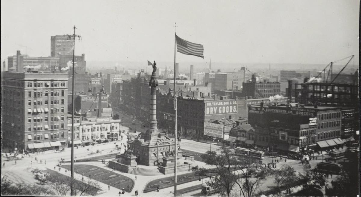 This 1897 view faces southeastward across Public Square at a time when low-rise storefronts still lined Public Square, including on future site of the Park Building at right. The Williamson Building also had not yet been built on the east side of the square. | Date: 1897 | Source: Cleveland Public Library Photograph CollectionDownload Original File