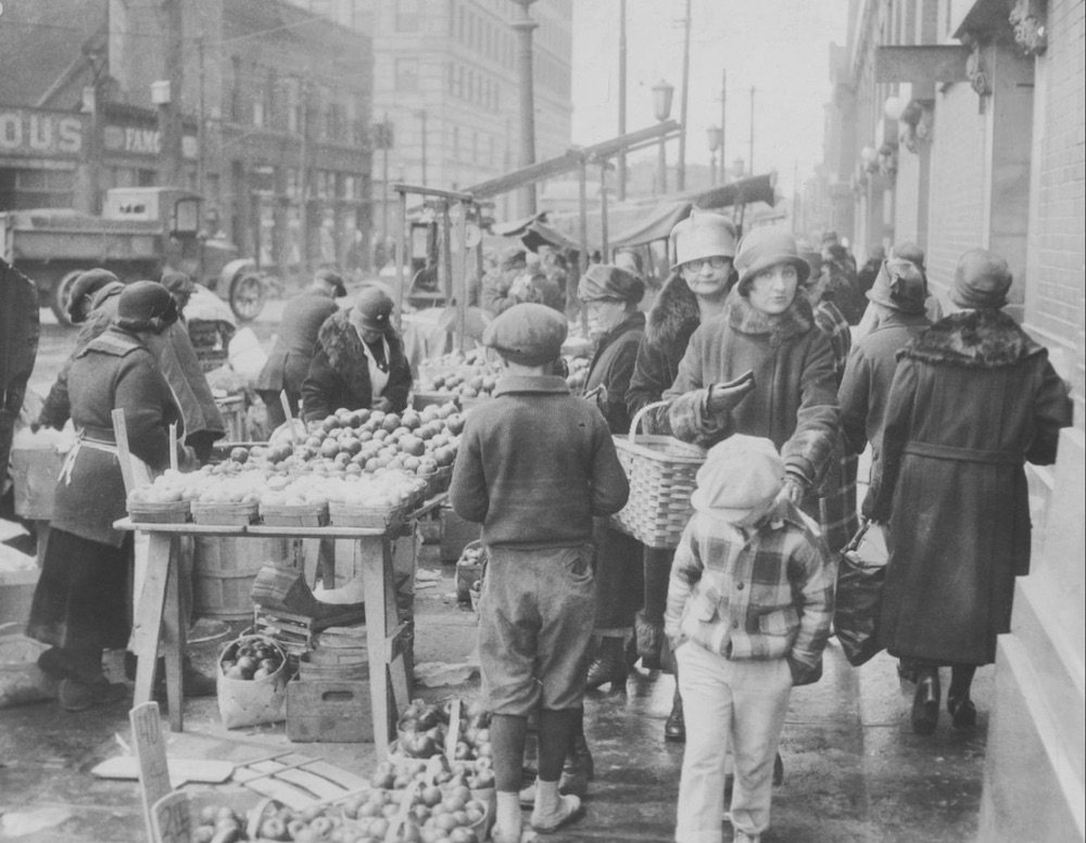 The West Side Market House had 110 stands in its concourse area and the Produce Arcade an additional 126 outside. It also for years allowed other merchants to set up temporary stands on Lorain Avenue on the south side of the market house. This 1927 photo shows Clevelanders shopping at several of these stands. | Source: Cleveland Public Library, Photograph CollectionDownload Original File