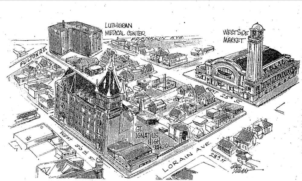 This sketch appeared with an article in the Plain Dealer on January 15, 1978, a year in which Cleveland renovated the West Side Market. These renovations, along with those scheduled to done at nearby Lutheran Hospital and St. Ignatius High School, were identified in the article as critical to stabilizing the Ohio City Neighborhood. | Source: Cleveland Public Library, Newspaper CollectionDownload Original File