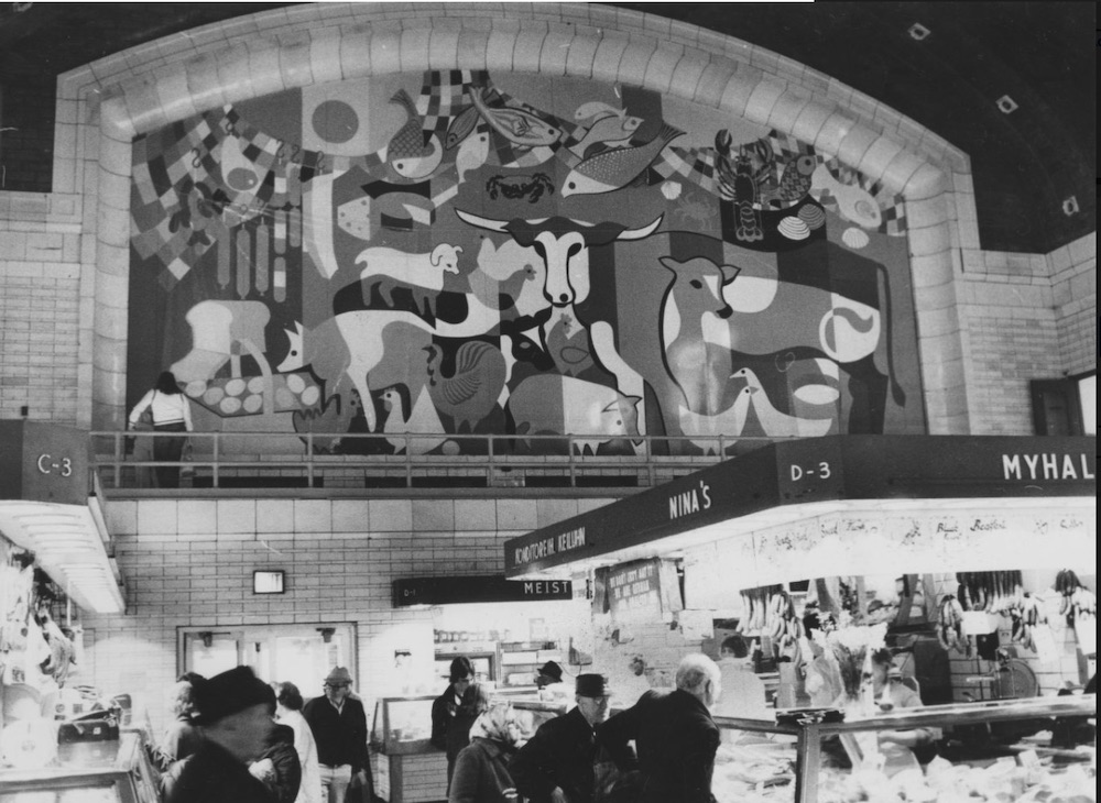In 1979, the year following the City's decision to cover the large arched windows on the east and west ends of the Market concourse with aluminum panels, murals were painted on those panels. This one on the west end of the concourse was created by Cleveland artist Nancy Martt. These murals remained in the Market until 2004 when they were removed and the original arched windows that brought natural light into the building were restored. This photo was taken in 1979. | Source: Cleveland State University, Michael Schwartz Library, Special CollectionsDownload Original File