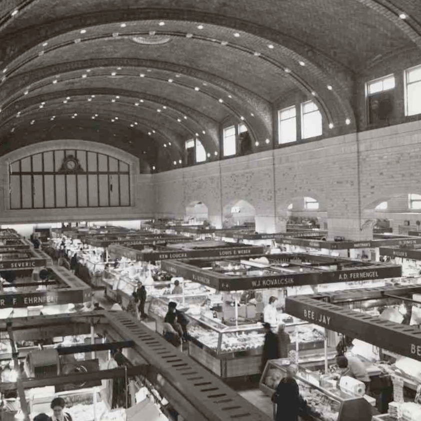 The market's vaulted ceiling, covered in terracotta tiles, is 44 feet tall at its highest point. The grandiosity of the market building was no accident. Its architects were said to be influenced by the Roman basilicas – large public halls built during the Roman Empire that were used for transacting legal and business matters. | Source: Cleveland State University, Michael Schwartz Library, Special CollectionsDownload Original File