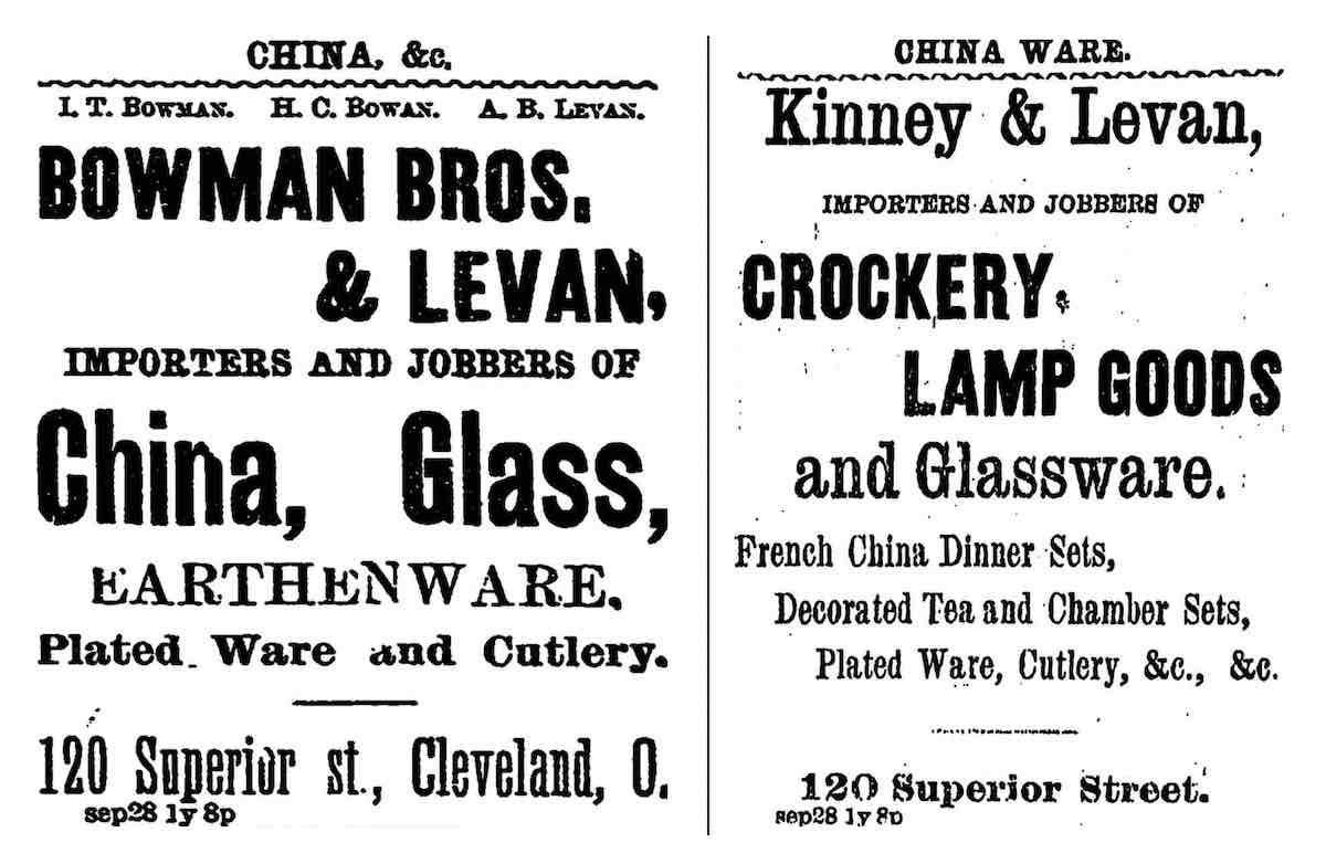 In 1883, Aaron B. Levan and George W. Kinney bought the former Bowman Bros. & Levan store at 120 W. Superior St., which also sold china and glassware, among other housewares. | Date: September 28, 1882, and February 19, 1883 | Source: Cleveland Plain DealerDownload Original File