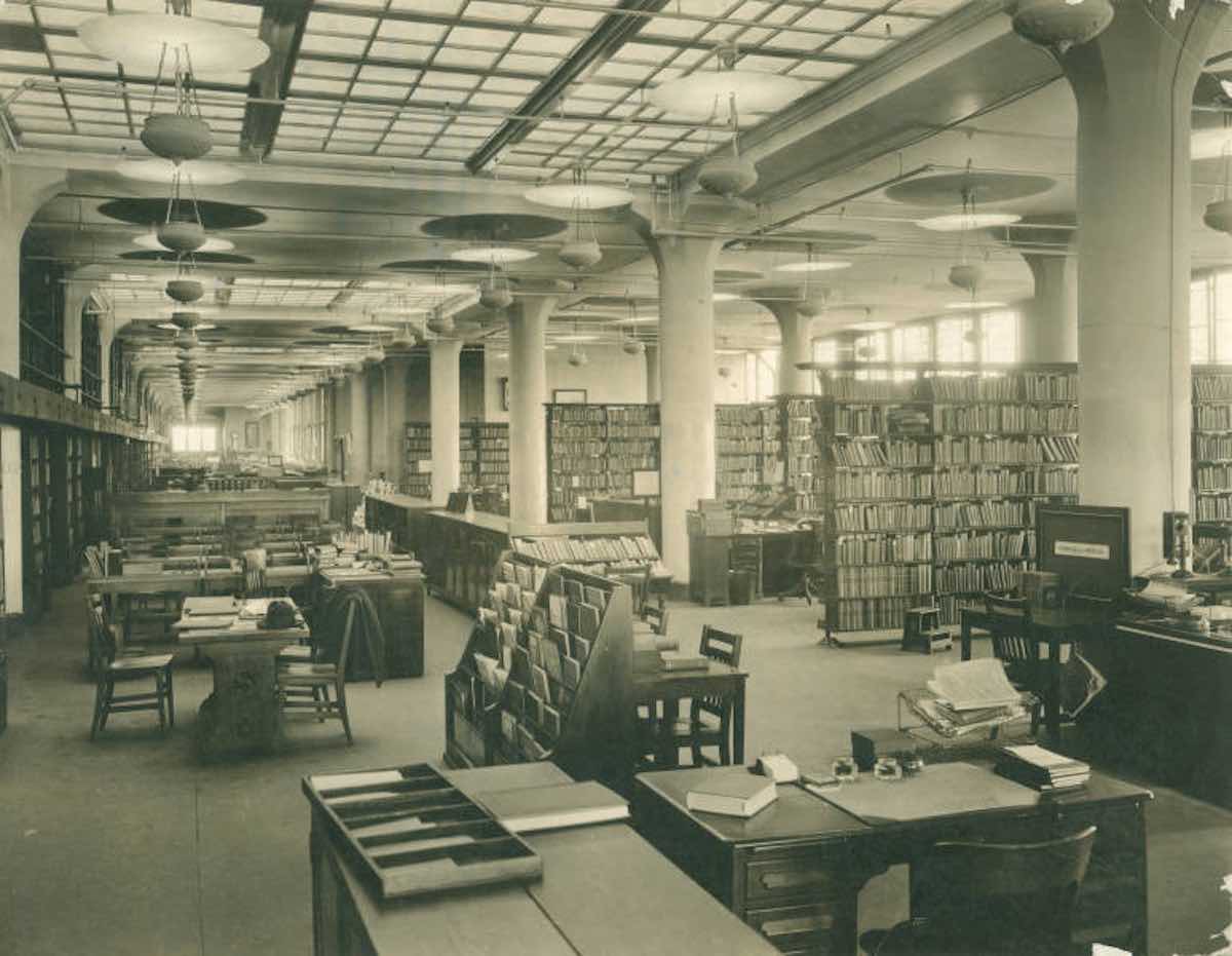 This interior view on the sixth floor shows the skylight and magazine rack. | Date: ca. 1915 | Source: Cleveland Public Library, Photograph CollectionDownload Original File