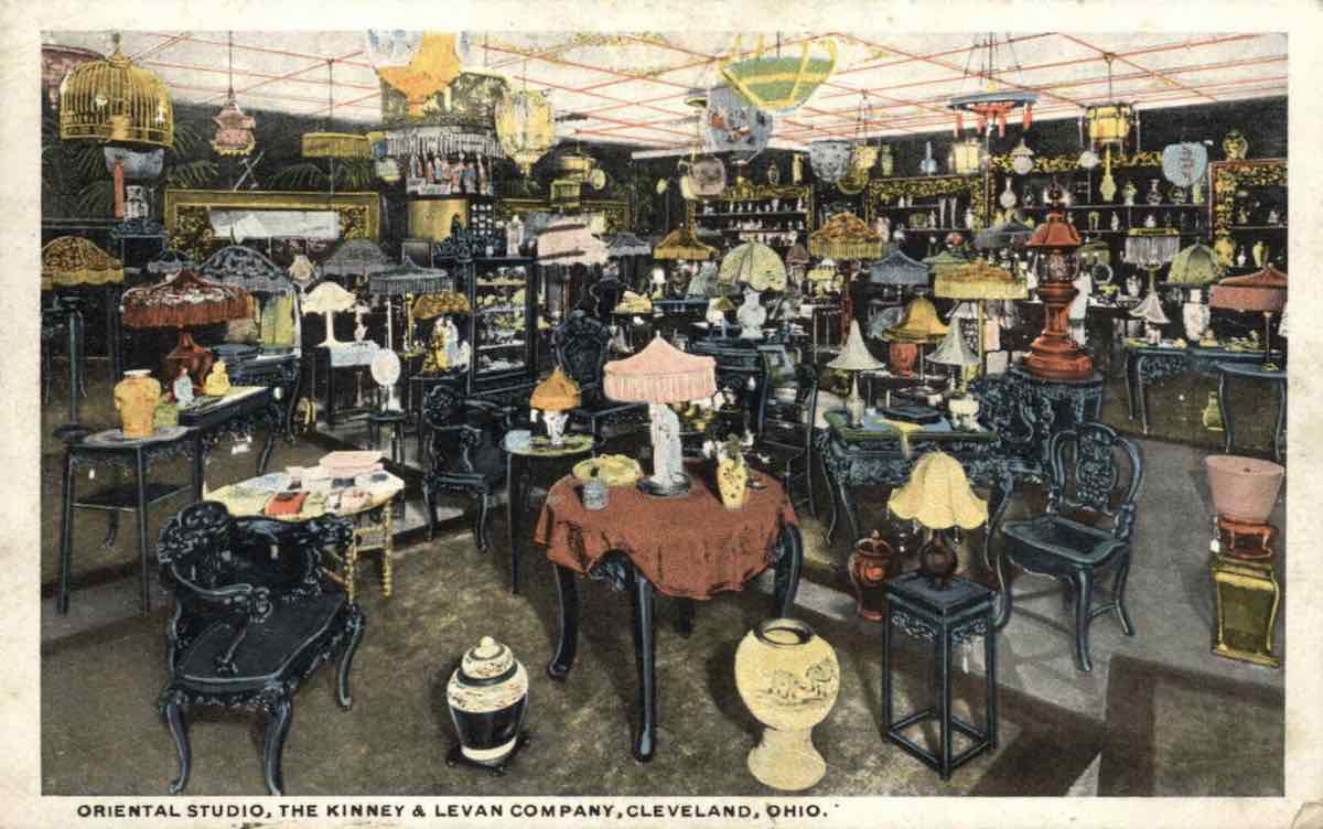 Opened in 1918, the Oriental Studio stocked lamps, chandeliers, vases, urns, and novelties imported from China. Chinese women in traditional attire served tea to customers. | Creator: Braun Post Card Co., Cleveland, Ohio | Date: ca. 1918Download Original File