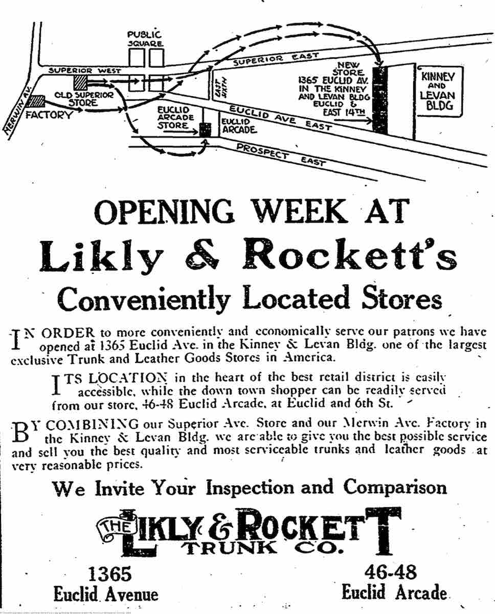 This trunk store was billed as one of the nation's largest. The map shows how the former Superior Avenue store and Merwin Avenue moved into combined space in the Kinney & Levan Building. | Date: April 12, 1916 | Source: Cleveland Plain DealerDownload Original File