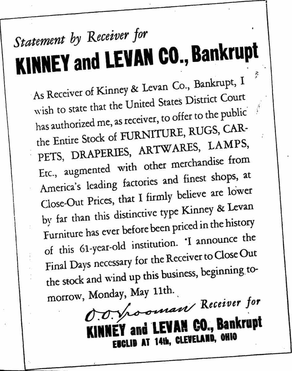 This statement from the receiver appointed by the court to administer Kinney & Levan in its bankruptcy points to the unprecedented bargains that awaited customers in these final days of the store's existence. | Date: May 10, 1936 | Source: Cleveland Plain Dealer