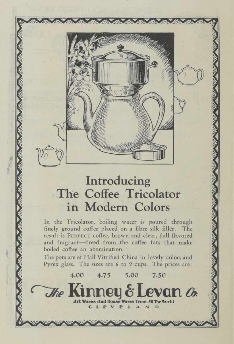 Advertisement ID: 11109 | This file appears in: Kinney & Levan An ad for a coffeemaker that appeared in a theater program. | Creator: Ohio Theater | Date: March 16, 1930 | Source: Cleveland Public Library Download Original File CreatorOhio TheaterSourceCleveland Public LibraryDateMarch 16, 1930 "Advertisement" appears in: Kinney & Levan