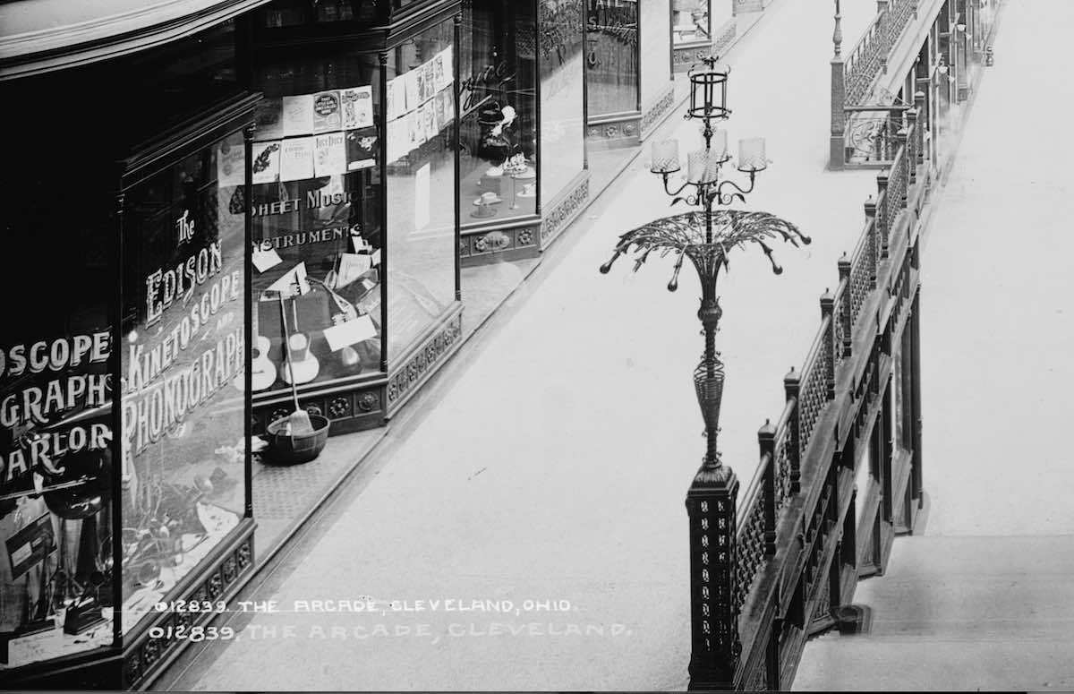 An early noteworthy tenant in the Arcade was Thomas Edison’s Ohio Phonograph Company. The Edison Phonograph and Kinetoscope Parlor occupied a space near the Euclid Avenue entrance from 1890 until 1902 and appears in this detail from a 1901 photo. Rumors say that Thomas Edison would smash the windows of any retailers selling his phonograph machine without his permission, an invention for which he held the patent. | Creator: Detroit Publishing Company | Date: 1901 | Source: Library of CongressDownload Original File