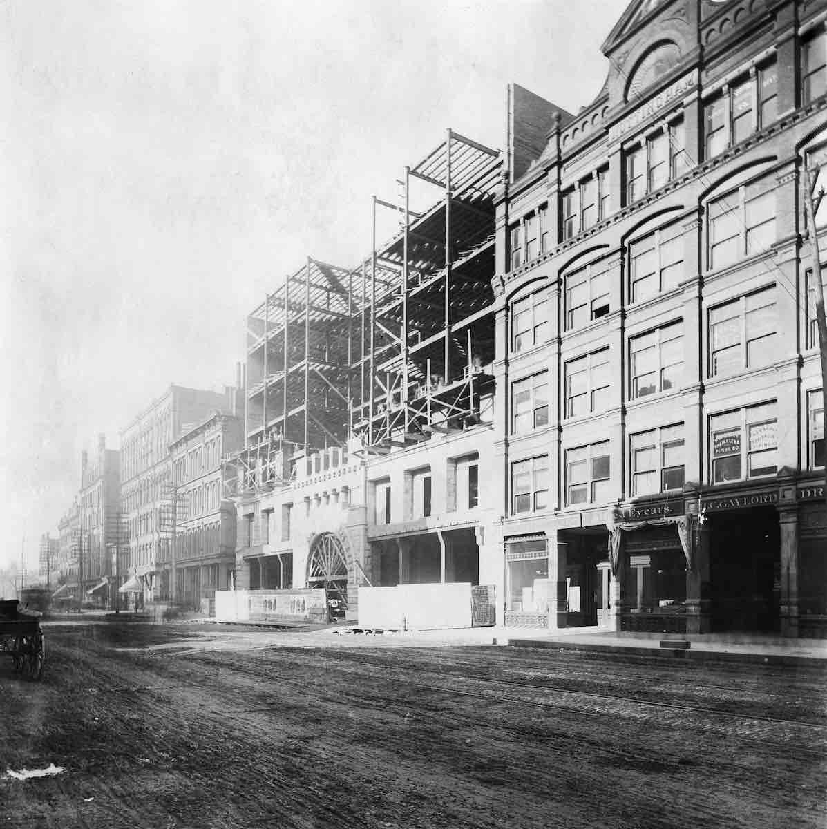 The Arcade's steel skeleton rises in this construction view. The Nottingham Block appears to the right. It is now the site of The Beacon apartment tower (515 Euclid Ave.). | Date: 1889 | Source: Cleveland Public LibraryDownload Original File