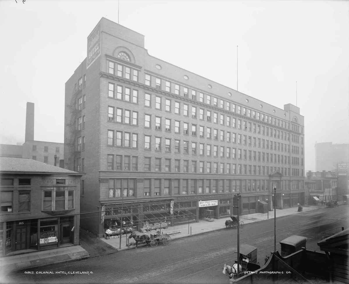 The Colonial Hotel opened on Prospect Avenue in 1898 in conjunction with the opening of the Colonial Arcade which connected to the hotel's main lobby. One of the finest hotels in Cleveland at the time of its opening, by the 1970s the Colonial Hotel had become rundown. In 2000, however, the hotel reopened as a Marriott Residence Inn as part of the multi-million dollar Colonial Marketplace project. This project also included the renovation and connection of the Colonial and Euclid Arcades. | Creator: Detroit Publishing Company | Source: Library of Congress