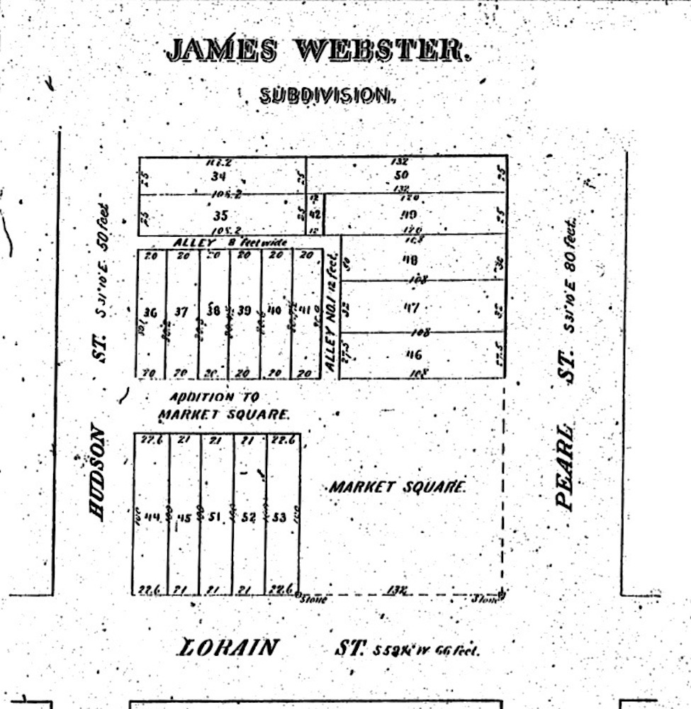 A real estate developer, Webster re-platted David Pollock's commercial land near the northwest corner of Pearl (W. 25th) and Lorain after acquiring it from Pollock in 1859. In the plat which he filed in 1864, he identified the public land on the northwest corner of Pearl and Lorain as "Market Square." It has been known by this name ever since. | Source: Cuyahoga County ArchivesDownload Original File