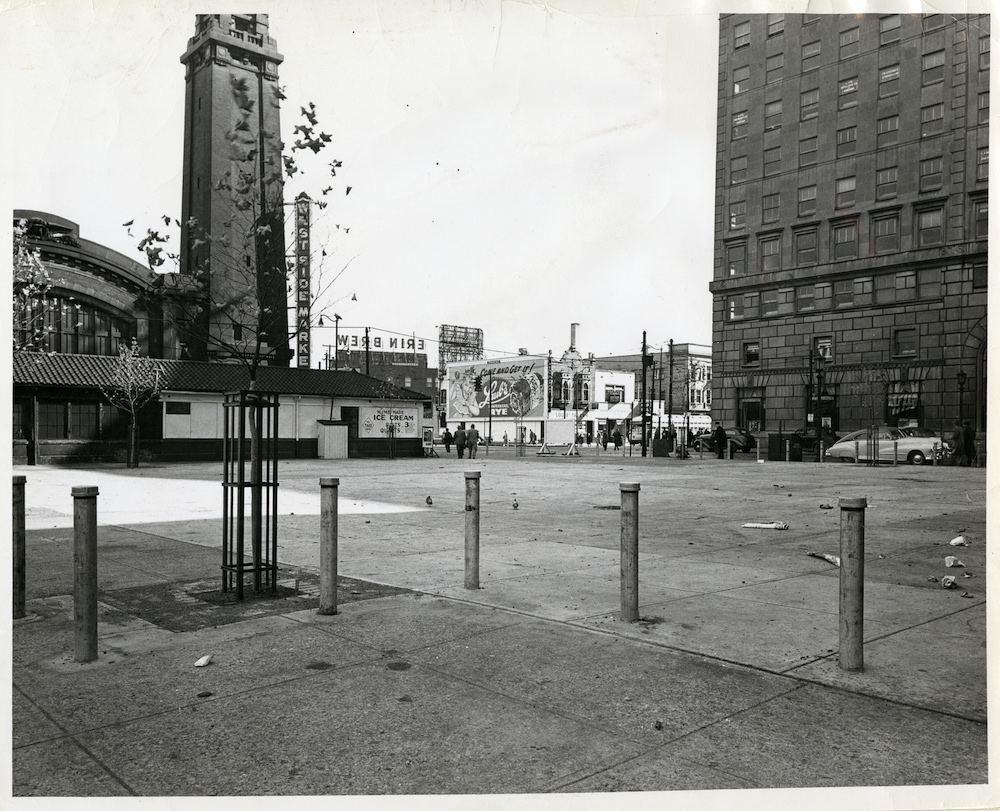 This photograph graphically shows the aging condition of Market Square in 1949. The posts seen in the foreground of the photo, as well in the background near Lorain Avenue, likely were placed there by the City to mark the boundary lines of Market Square. If so, they could be replacements for the original wooden "landmark" posts that Cleveland ordered to be placed along the "corners" of the Square shortly after Common Pleas Court upheld Cleveland's title to the land in 1858. | Source: Cleveland Public Library, Photograph CollectionDownload Original File