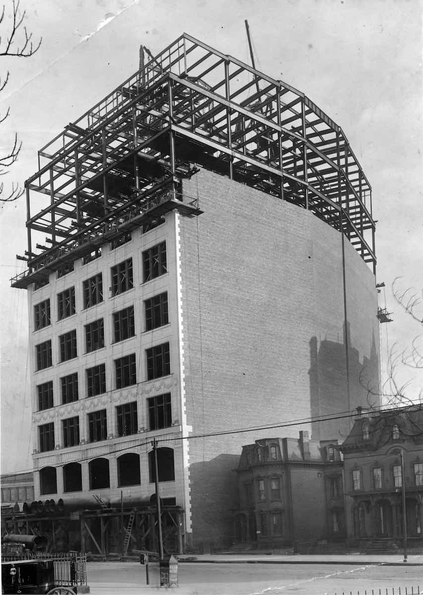 This photo of the still-exposed steel frame of the upper floors of the Pope Building makes clear that upper Euclid Avenue was in transition from Millionaires' Row to downtown in the early 20th century. Two 19th-century homes still stood to its west, at times literally in the shadow of the new Pope Building. | Date: 1908 | Source: Cleveland Public Library, Photograph CollectionDownload Original File