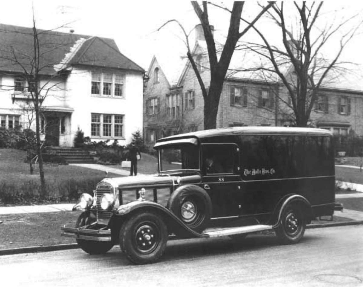 This Halle Bros. delivery vehicle sits in front two suburban houses. Even before suburbanites came to rely on the convenience of shopping malls in later years, they could avail themselves of the store's home delivery service, which had started in the 1890s as part of Halle Bros.'s mail-order business. In 1910, Halle Bros. converted to a fleet of motorized delivery vehicles made by Cleveland-based White Motor Co. and auctioned off its team of horses, seven delivery wagons, and related accoutrements. | Date: 1930 | Source: Cleveland Memory, Michael Schwartz Library Special Collections at Cleveland State University