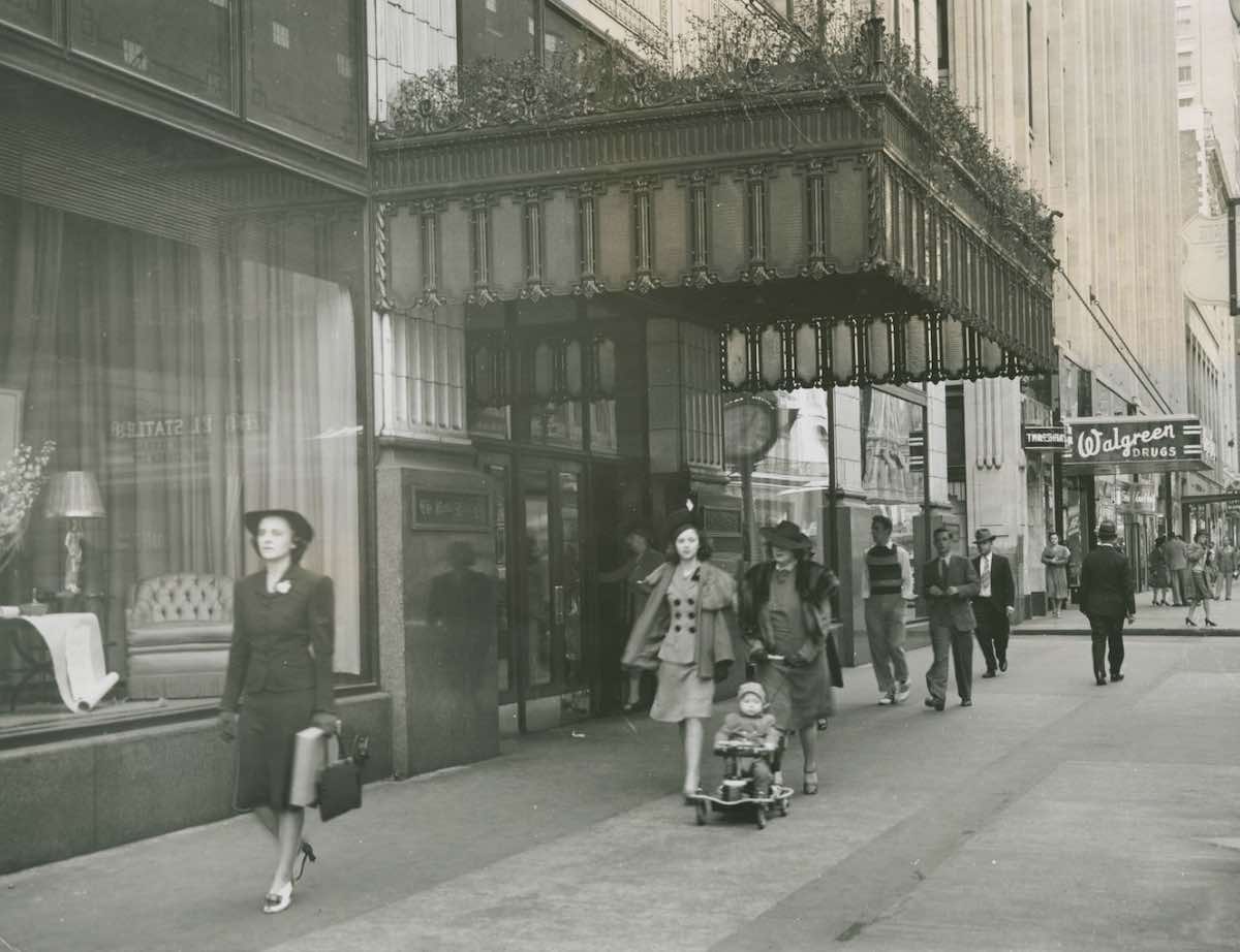 Shoppers stroll past the west Euclid Avenue entrance to the department store. The Walgreen's Drugs sign in the background was on the ground-floor of the Cleveland Athletic Club Building, now The Athlon apartments. | Creator: Frank Jaffa, Ohio Federal Writers Project | Date: 1940 | Source: Ohio Guide Photographs, Ohio History ConnectionDownload Original File