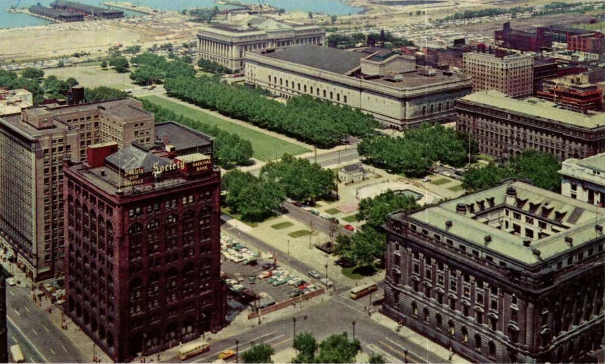 By the late 1950s, the Chamber of Commerce Building had fallen for a surface parking lot, the first such space along Public Square to do so—decades before the western flank was razed for an Ameritrust Tower that literally never got off the ground. The future site of the Society (Key) Tower remained a parking lot for about a quarter of a century. | Creator: George R. Klein News Company | Date: ca. 1960 | Source: Cleveland Memory Project, Cleveland State University Library Special CollectionsDownload Original File