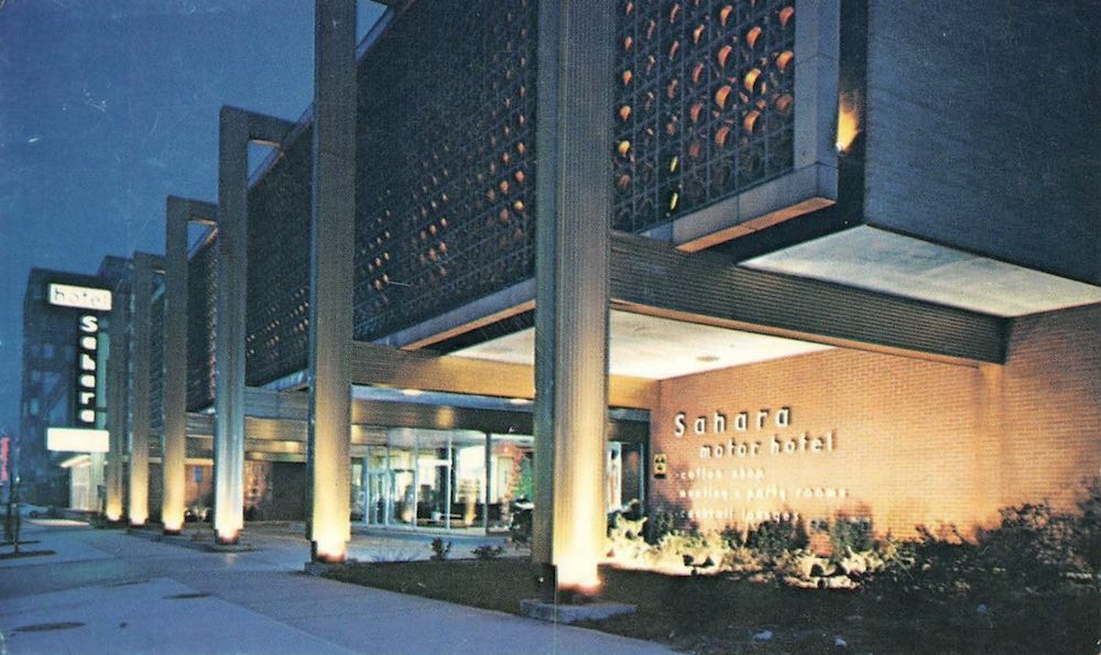 By the 1960s, many automobile-oriented businesses lined Euclid Avenue, including used-car lots, filling stations, and motels, including the Sahara, which stood near the Masonic Auditorium and the Arena and also provided an upscale resort-like alternative to conventional downtown hotels. | Creator: Hexter & Assoc., Inc. | Source: Cleveland Memory Project, Cleveland State University Library Special CollectionsDownload Original File