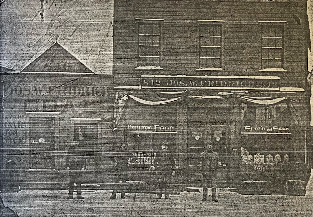 This circa 1902 photograph shows these two storefronts on Lorain Avenue when for a several year period they were both leased by Joseph W. Fridrich for his coal and flour & feed businesses. The building on the left had earlier been leased by Fridrich and his brother August Schmitt for the retail coal store the two operated from 1885 until 1900 when their partnership was dissolved. The building on the right was home to Fridrich's short-lived flour and feed business, and, after it closed in 1904, was leased to Walter J. Meyers, who operated a retail bicycle shop there for the next 4-5 years. After Meyers closed his store in 1909, the Joseph W. Fridrich family opened their own bicycle shop in that store front. It remained the site of the Fridrich Bicycle store until 1925 when the business was moved to a new location across Lorain Avenue.