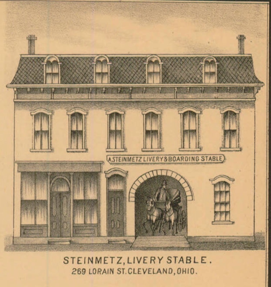This Stable and Livery Building was built for Andrew Steinmetz on the north side of Lorain Avenue, a block west of Fulton Road, in circa 1871. It also served the Steinmetz family as a saloon and the offices of their undertaking business. In 1925, long after the Steinmetz family had sold the building, it was purchased by the Fridrich family for their growing retail bicycle and auto parts and supplies businesses. This sketch appeared in the 1874 Atlas of Cuyahoga County.