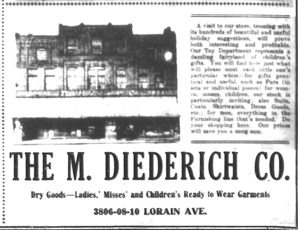 According to architectural historian Craig Bobby, the original Schenck Building was constructed in 1892, but was greatly expanded by an addition thereafter constructed in 1894. It was built for J. C. Schenck, a mason contractor, and leased by Schenck to several dry goods businesses until it was sold in 1904 to the Diederich family, owners of he M. Diederich Co. dry goods (department) store. The M. Diederich Co. owned the building until 1942 when it was sold to Helene Fridrich, wife of Joseph Aloysius Fridrich, thereafter becoming part of the Fridrich Bicycle building complex at 3800 Lorain. This ad for The M. Diederich Co. appeared in the December 21, 1914 edition of the Cleveland News. | Source: Craig BobbyDownload Original File