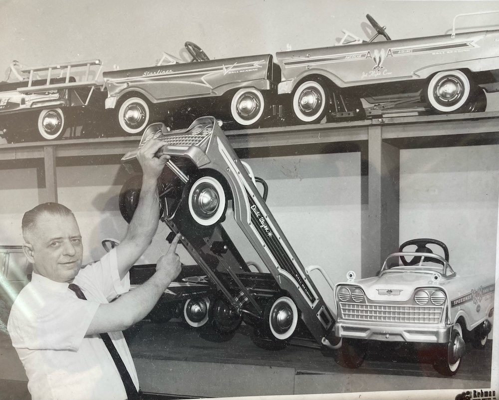 Fridrich Bicycle may have witnessed its best years in the decades of the 1940s through 1960s. In addition to selling a variety of bicycles (both wholesale and retail), auto parts and supplies, and operating a license bureau in the store, Fridrich sold other popular items including these children's cars that were very popular in the 1950s. In this undated photo, Joseph J. Fridrich examines one of those cars.
