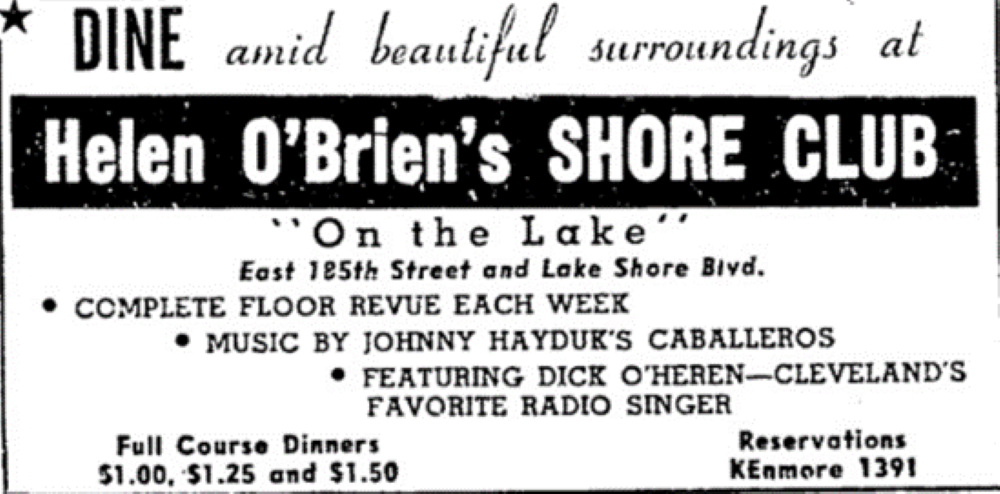 Helen O'Brien's Shore Club Advertisement ID: 11244 | This file appears in: The Shore Clubs of Collinwood Helen O’Brien took over the Alpine Shore Club and renamed it Helen O’Brien’s Shore Club. | Creator: Plain Dealer | Date: June 5, 1938 Download Original File CreatorPlain DealerDateJune 5, 1938 "Helen O'Brien's Shore Club Advertisement " appears in: The Shore Clubs of Collinwood