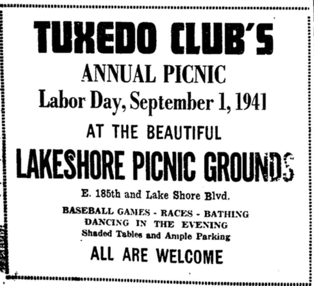 Tuxedo Club at Lake Shore Picnic Grounds Advertisement ID: 11246 | This file appears in: The Shore Clubs of Collinwood The Lake Shore Picnic Grounds held annual picnics, such as the Tuxedo Club’s Annual Picnic. | Creator: Call & Post | Date: August 30, 1941 Download Original File CreatorCall & PostDateAugust 30, 1941 "Tuxedo Club at Lake Shore Picnic Grounds Advertisement" appears in: The Shore Clubs of Collinwood