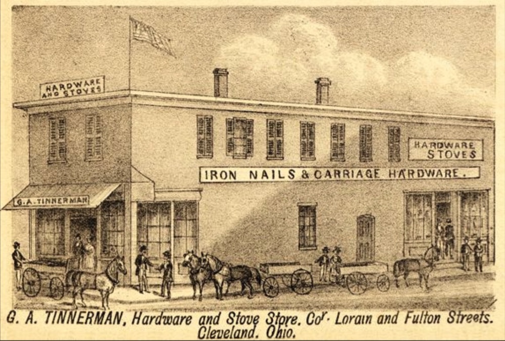 The 1874 Cuyahoga County Atlas featured sketches of several commercial businesses located on or near the vibrant intersection of Lorain and Fulton on Cleveland's west side. The hardware and stove store of George Tinnerman was one of them. Tinnerman, a German immigrant like Henry Leopold, opened his business on the northeast corner of the intersection, across Lorain Street from Leopold's store, in the late 1860s. And, also like Henry Leopold, George Tinnerman's business grew over the decades and he built successively taller and larger commercial buildings on his corner of the intersection to accommodate that growth. | Source: Cleveland Public Library, Digital Map CollectionDownload Original File