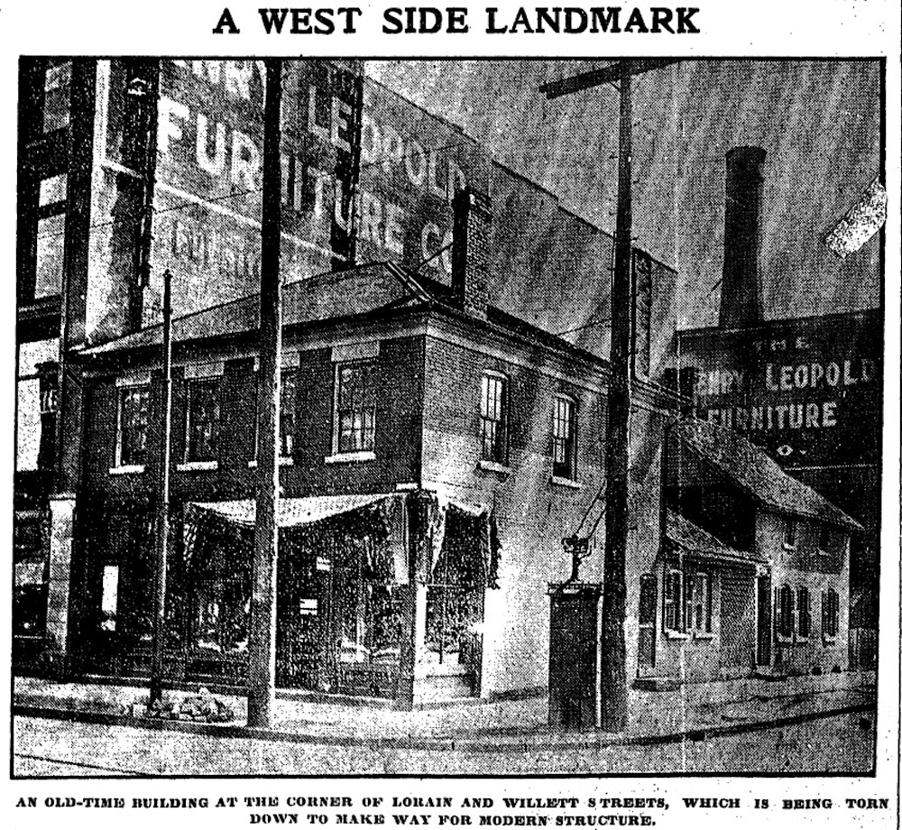 In 1903, Leopold's Furniture expanded its business footprint to the southeast corner of Lorain and Fulton (then Rhodes, and before that Willett), in the process razing an historic Greek Revival-style brick building that for many years had been the tailor shop and residence of Ernst Knippenberg, yet another merchant of Lorain Street who was a German immigrant. This photograph and article appeared in the October 3, 1903, edition of the Cleveland Leader.