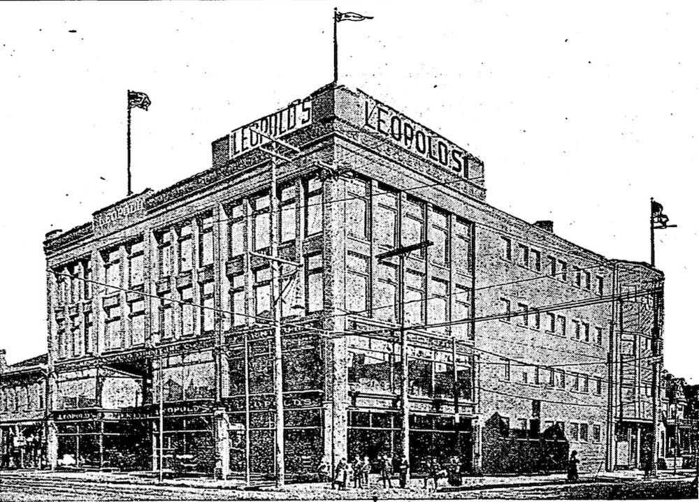 That was how the Plain Dealer described Henry Leopold's furniture store upon opening of the store's new four story addition on September 28, 1904. With its many large plate glass windows facing both Lorain and Fulton (then "Rhodes"), the new addition dramatically changed the entire look of the southeast corner of the Lorain-Fulton intersection. This photo appeared in the Plain Dealer on June 20, 1915. | Source: Cleveland Public Library, Digital Newspaper CollectionDownload Original File