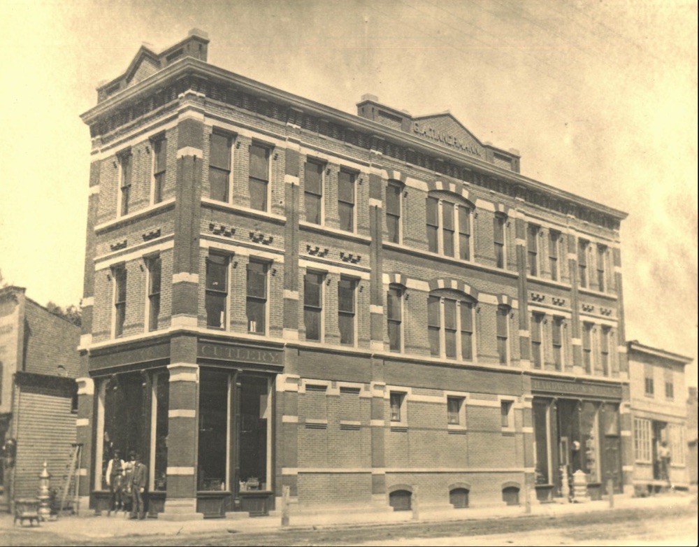 As a result of the growth of his business in the decades of the 1860s and 1870s, which perhaps was fueled by the construction of the Fulton Road branch of the West Side Street Railway (streetcar) in 1879, George Tinnerman razed his commercial building (featured in the 1874 Cuyahoga County Atlas) and erected in its place an elegant three-story commercial building that was designed by Cleveland architect Andrew Mitermiler. It featured an exterior facade of bricks and sandstone arranged in a manner called polychromatic structuring, according to local architectural historian Tim Barrett. A decade later, he built on the north side of the building a substantial addition designed by the architectural firm of Sprackling and Matzinger. In 1915, after George Tinnerman closed his retail store on Lorain, the building was razed, and in its place, Lorain Street Savings Bank built the four-story Beaux-Arts style building which, as of 2022, still stands on northeast corner of the Lorain-Fulton intersection. | Source: Tinnerman Lofts websiteDownload Original File